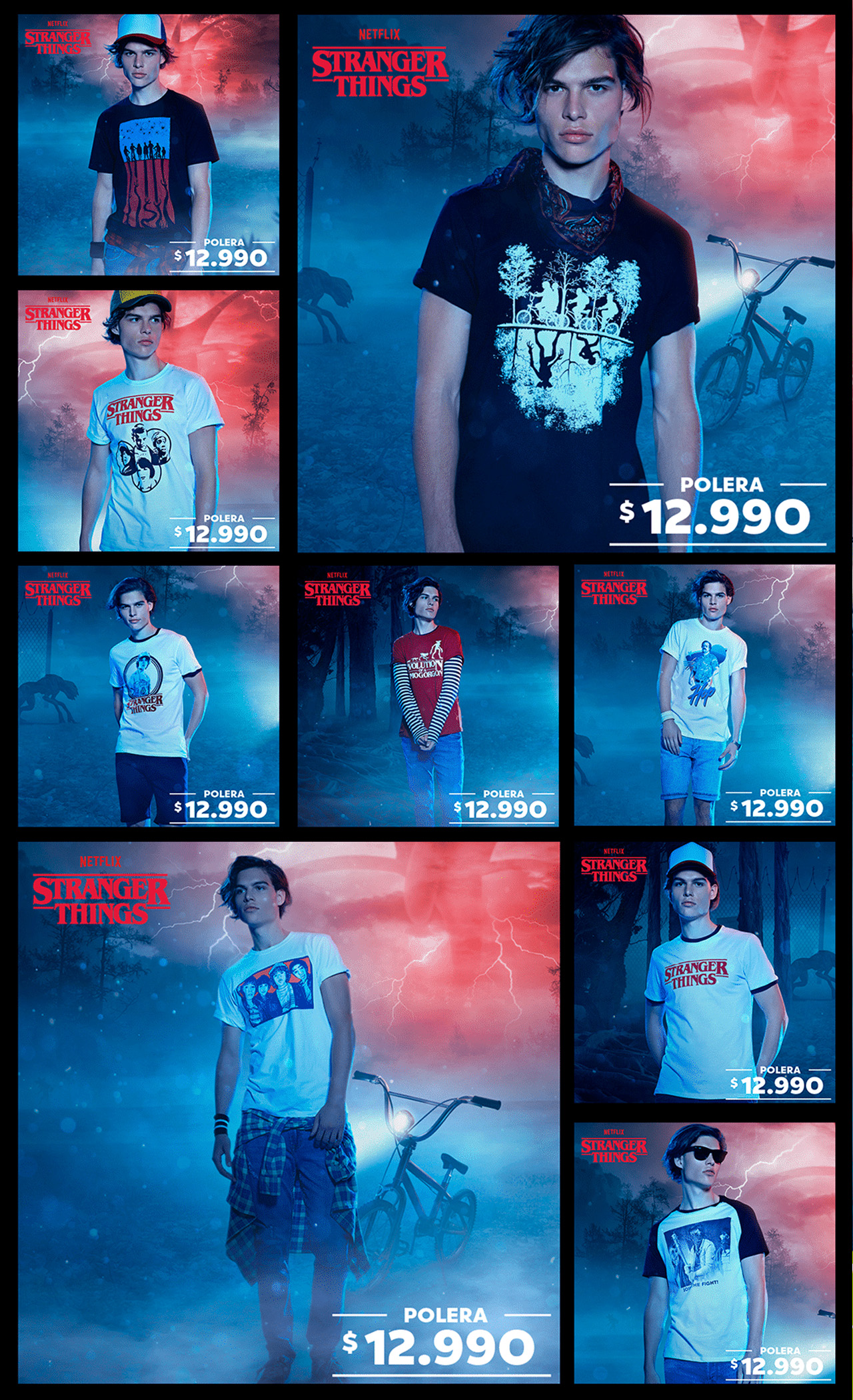 Stranger Things llegaba a Falabella con una edición limtada de poleras. Para este lanzamiento, quisimos llevar el mundo de Stranger Things a las tiendas de Falabella y también a su publicidad.